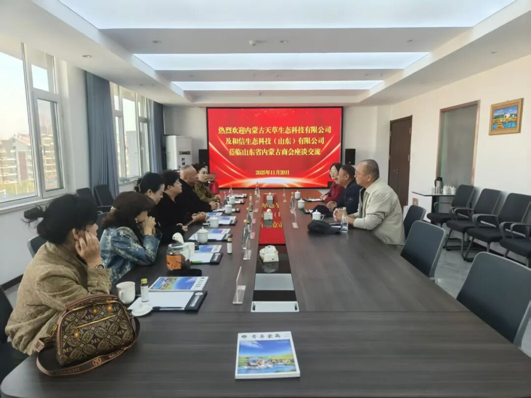 11 月 20 日,内蒙古天草生态科技有限公司、和信生态科技(山东)有限公司一行 6 人到访山东省内蒙古商会座谈交流。山东省内蒙古商会会长韩振涛、轮值会长邢建武、副秘书长李冲对到访嘉宾进行热情接待,双方围绕深化合作、资源共享等议题展开深入交流。